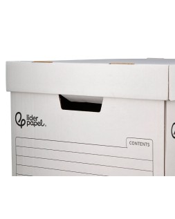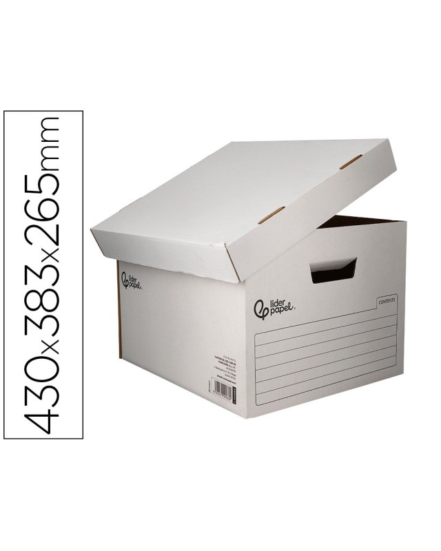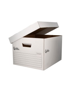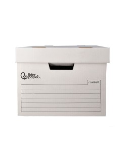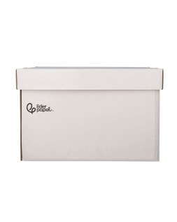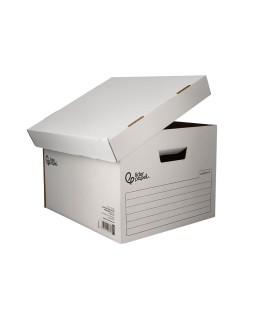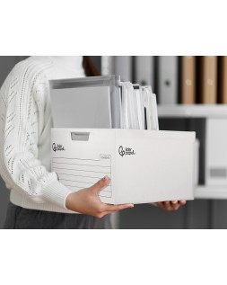 Cajón contenedor de archivo. Ideal para almacenar documentos, carpetas y archivo defintivo. La caja posee un sistema de montaje automático que permite que la caja quede montada de forma instantánea, solo es necesario presionar en los vértices para que el fondo de la caja quede montado. La tapa es removible para poder insertar y extraer los archivos con mayor comodidad. Tiene asas en los laterales para que puedas transportarla de forma cómoda y segura. Con zona de etiquetaje para poder identificar los archivos u objetos almacenados en su interior. Este cajón contenedor tiene capacidad para 4 cajas de archivo defintivo tamaño folio o 5 archivadores A-Z. Este cajón contenedor color kraft está fabricado en cartón 100% reciclado y reciclable. Las medidas de la caja son 430x383x265 mm