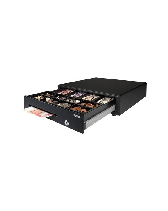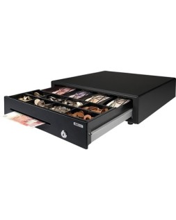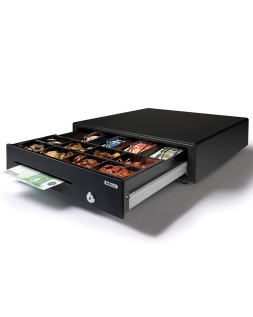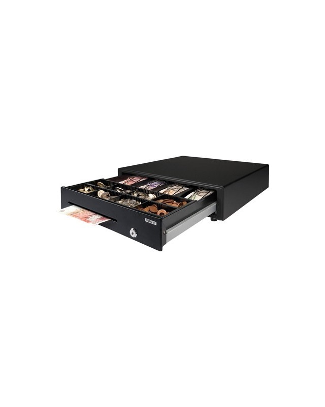 Robustos rodillos con cojinetes de bolas. Testado para al menos 1 millón de aperturas. Robustas pinzas de metal. Sencilla apertura por presión. Gaveta ajustable y extraíble. 4 compartimentos para billetes y 8 compartimentos para monedas. Compatible con cajas registradoras con conexión RJ12 (12V). Medidas: 410 x 115 x 415 mm. Peso: 6,6 kg.