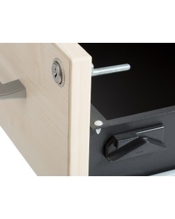 Estructura de melamina de 25 y 19 mm de grosor con canto de PVC de 2 mm. Tiradores metálicos con acabado aluminio. Sistema de cierre con cerradura y sistema antivuelco para cada uno de los cajones. La tapa superior y los frontales de cajones pueden ser en dos acabados distintos: haya y gris.
