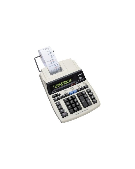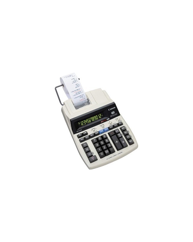 Calculadora impresora con pantalla de 12 dígitos. Impresión a 2 colores. Velocidad de impresión 2 líneas por segundo. Parcialmente fabricada con materiales de productos Canon reciclados. Funciones de reloj y calendario. Con tecla de triple cero, conversión de divisas, cálculo de impuestos, redondeo. Medidas: 203 x 292 x 72 mm. Peso: 960 g.