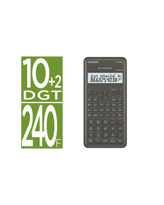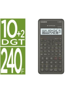 Calculadora científica. Pantalla LCD de dos líneas. 10+2 dígitos. 240 funciones. Con carcasa rígida. Funciona con 1 pila AAA. Funciones estadísticas y trigonométricas. Cálculo de porcentajes y totales. Memoria acumulativa. Funciones hiperbólicas e inversas. Cálculo de fracciones, estadística bidimensional con cálculo de media, valor estimado y suma. Medidas: 77 x 161,5 x 13,8 mm. Peso: 115 g.