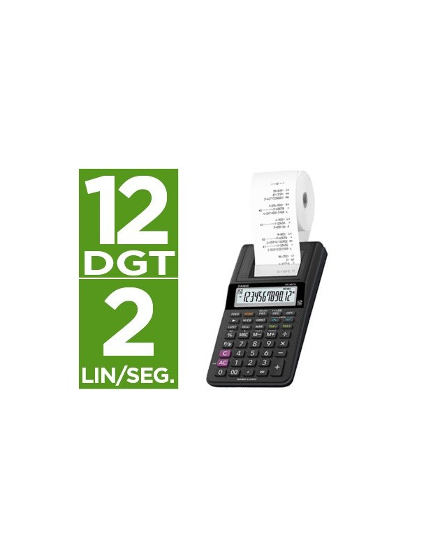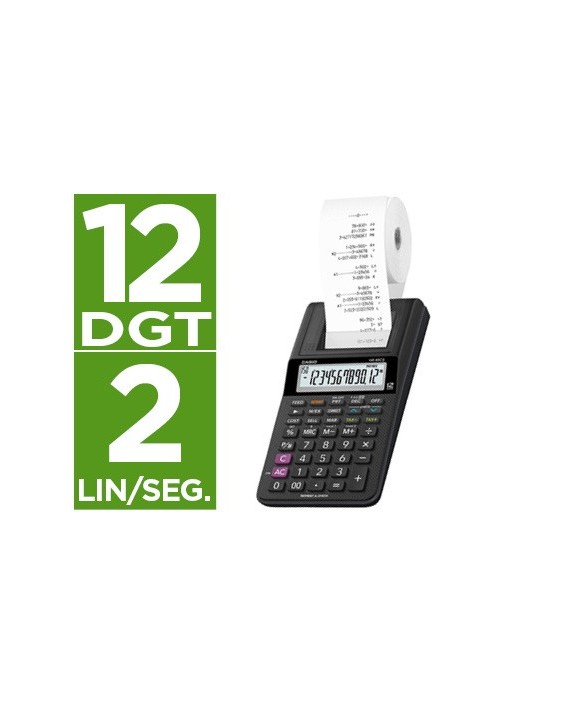 Calculadora impresora con pantalla LC de 12 dígitos. Cálculo de ganancias, cálculo de impuestos, cálculo de porcentajes, tecla doble cero. Usa papel de 58 mm de ancho y cinta de entintar IR-40. Velocidad de impresión: 1,6 líneas/segundo. Funciona con 4 pilas AA. Adaptador de CA opcional (AD-A60024). Color negro. Medidas: 99 x 196 x 41,1 mm. Peso aprox.: 271 g.