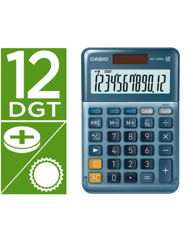 Pantalla LCD extragrande de 12 dígitos. Solar y a pilas. Acabado metálico. Con cálculo avanzado de porcentaje, conversión de moneda en euros. Cálculo de costo / venta / margen de beneficio, cálculo de margen, placa frontal de aluminio noble, azul. Funciona con 1 pila LR1130. Medidas: 101 x 149 x 28 mm. Peso: 120 g.