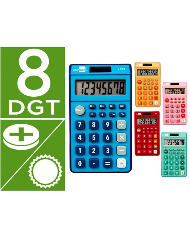 Calculadora liderpapel bolsillo xf14 8 digitos solar y pilas 115x65x8 mm expositor de 16 unidades colores