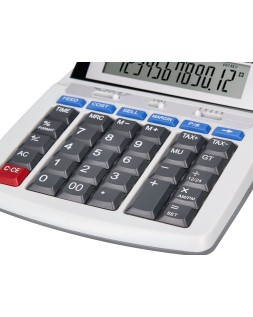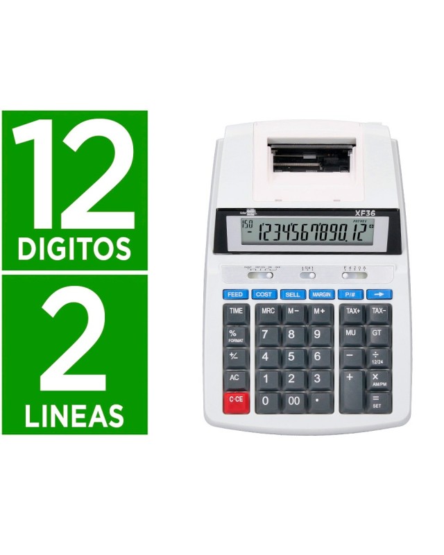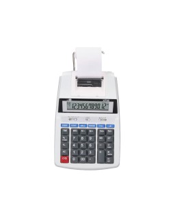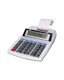 Calculadora impresora con pantalla de 12 dígitos. Utiliza rollo de papel de 57 mm de ancho por 25 mm de diámetro. Impresión en 2 colores. Con tecla de memoria, redondeo, tecla doble cero, tecla programable de impuestos, margen de beneficio, precio de coste y precio de venta. Funciona con 4 pilas AA y una pila CR2032. Pilas incluidas. Color blanco. Medidas: 235 x 155 x 62 mm. Peso: 490 g.