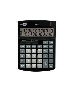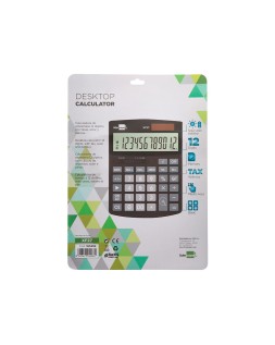 Calculadora de sobremesa de 12 dígitos. Teclas de encendido y apagado. Funciones de tasas y ratio, redondeo decimal, posición decimal, función GT. Tecla doble cero y de corrección de entrada. Solar y a pilas. Funciona con pilas LR1130. Color negro. Medidas: 155 x 115 x 25 mm. Peso: 265 g.