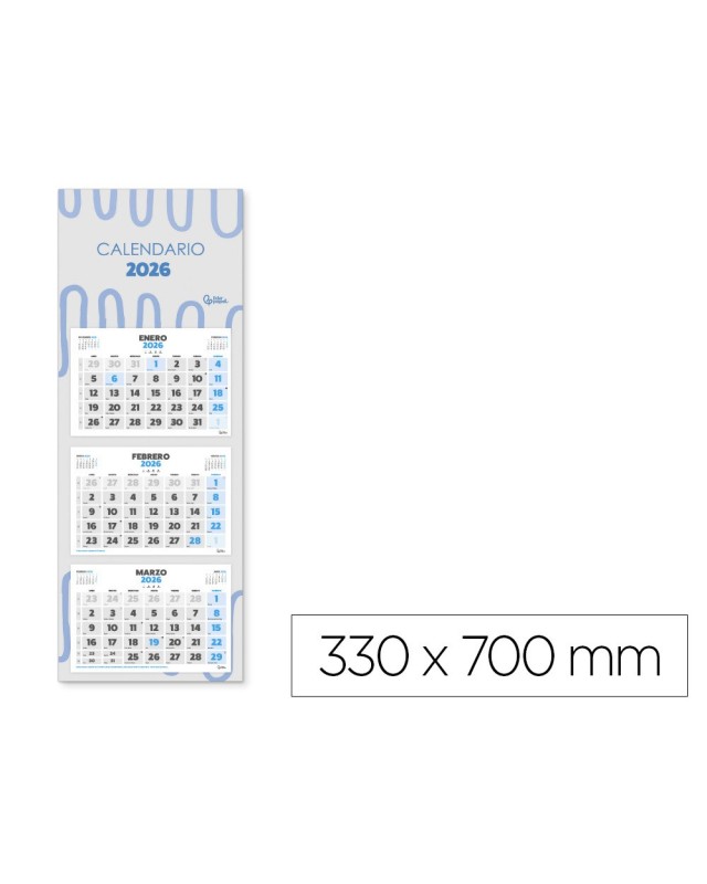Calendario pared liderpapel 3 meses vistas 2026 plegable 33x70 cm papel 90 gr
