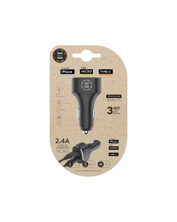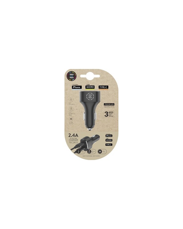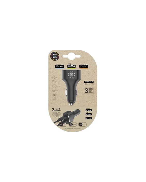 Cargador tech one tech 2.4 coche mechero doble para iphone / usb micro / type-c color negro