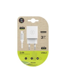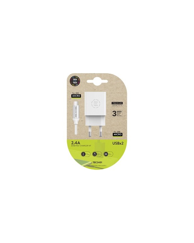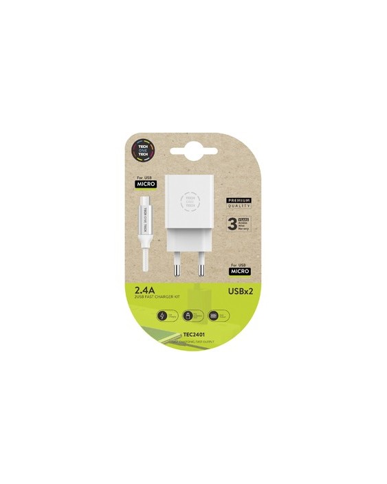 Cargador tech one tech 2.4 doble usb + cable braided nylon micro usb android longitud 1 mt color blanco