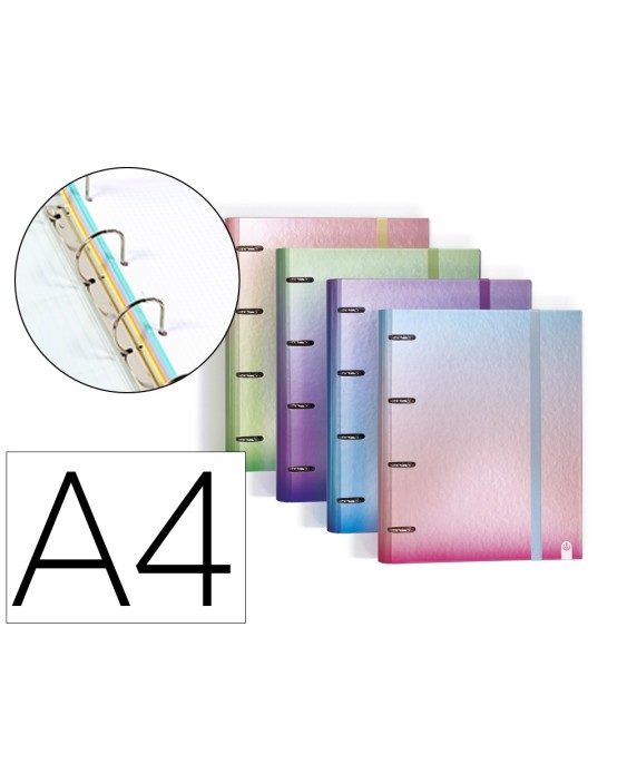 Carpeblock de cartón forrado plastificado Metal Gradient con 4 anillas de 35 mm. En colores extra brillantes metalizados con acabado especial anti rayas. Incluye recambio cuadriculado de 100 hojas de 90 gr con 1 banda de color. Lomo curvo, apertura 360º y goma plana de cierre. Disponible en colores surtidos metalizados.