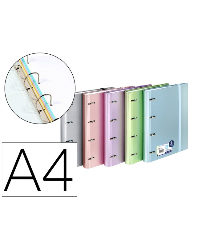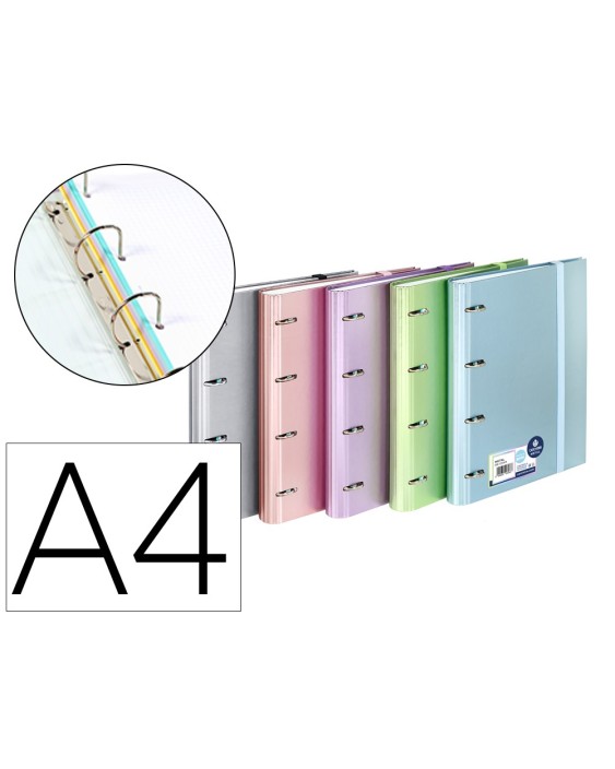 Carpeblock de cartón forrado plastificado Metal con 4 anillas de 35 mm. Encolores extra brillantes metalizados con acabado especial anti rayas. Inc luye recambio cuadriculado de 100 hojas de 90 gr con 1 banda de color. Lomo curvo, apertura 360º y goma plana de cierre. Disponible en colores surtidos metalizados.