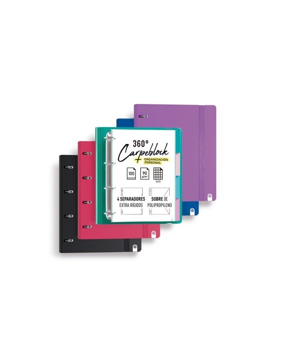 EL CARPEBLOCK 360º DE POLIPROPILENO FOAM DE CARCHIVO® ES EXTRA RÍGIDO Y ULTRA LIGERO, CON UN GROSOR DE 2 MM. EQUIPADO CON 4 ANILLAS MIXTAS DE 35 MM Y SISTEMA RADO, SU LOMO CURVO ERGONÓMICO PERMITE UNA APERTURA DE 360º. INCLUYE EL RECAMBIO BONUS DE 100 HOJAS CUADRICULADAS 5X5 DE 90 G/M² CON ORGANIZADOR DE CARCHIVO, UN SOBRE DE POLIPROPILENO CON SOLAPA Y CIERRE DE VELCRO PARA PEQUEÑOS OBJETOS. ADEMÁS, CUENTA CON GOMA PLANA A JUEGO Y 4 SEPARADORES. CARACTERÍSTICAS: MATERIAL: POLIPROPILENO FOAM 2 MM ANILLAS: 4 MIXTAS DE 35 MM EXTRAS: SOBRE DE PP, RECAMBIO DE 100 HOJAS, 4 SEPA