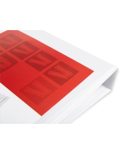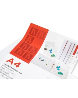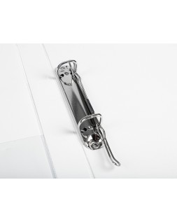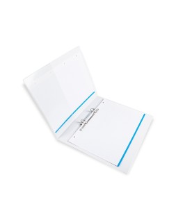 Carpeta fabricada en cartón forrado en plástico soldado de color blanco. 5 mm de grosor. Con funda transparente soldada en su interior. Carpeta con funda en la portada, contraportada y lomo que permite su personalización e identificación. Anillas mixtas. Con compresor metálico. Formato DIN A4. Medidas: 283 x 320 mm.