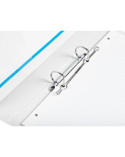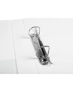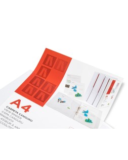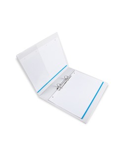 Carpeta fabricada en cartón forrado en plástico soldado de color blanco. 5 mm de grosor. Con funda transparente soldada en su interior. Carpeta con funda en la portada, contraportada y lomo que permite su personalización e identificación. Anillas mixtas. Con compresor metálico. Formato DIN A4. Medidas: 283 x 320 mm.