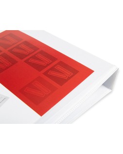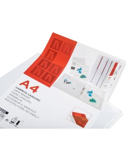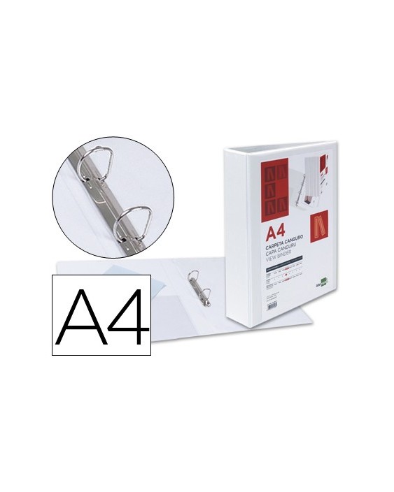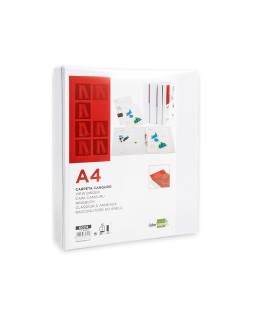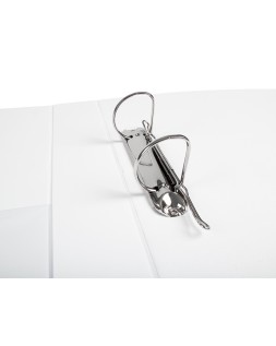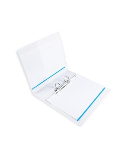 Carpeta fabricada en cartón forrado en plástico soldado de color blanco. 5 mm de grosor. Con funda transparente soldada en su interior. Carpeta con funda en la portada, contraportada y lomo que permite su personalización e identificación. Anillas mixtas. Con compresor metálico. Formato DIN A4. Medidas: 283 x 320 mm.