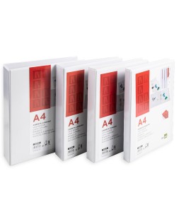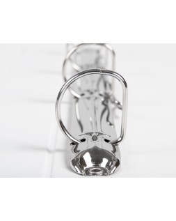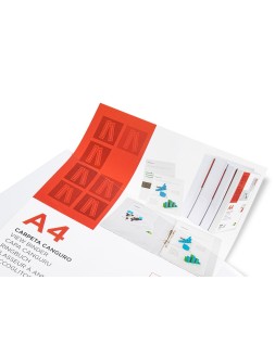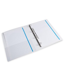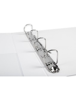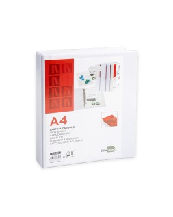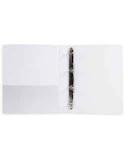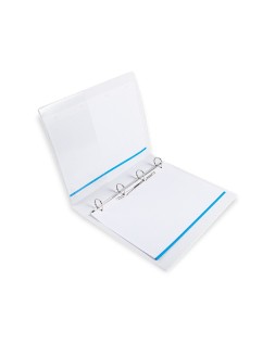 Carpeta fabricada en cartón forrado en plástico soldado de color blanco. 5 mm de grosor. Con funda transparente soldada en su interior. Carpeta con funda en la portada, contraportada y lomo que permite su personalización e identificación. Anillas mixtas. Con compresor metálico. Formato DIN A4. Medidas: 283 x 320 mm.
