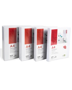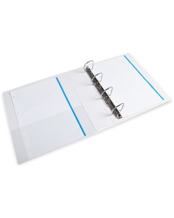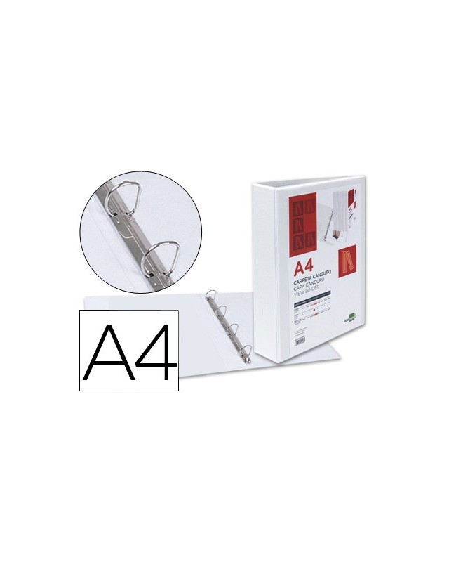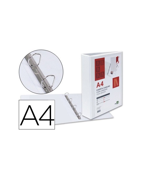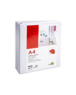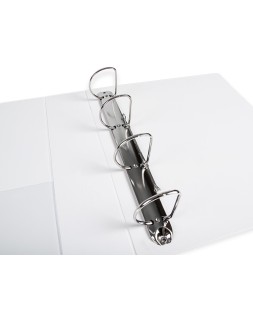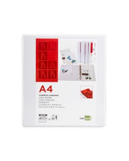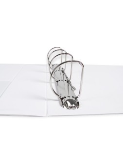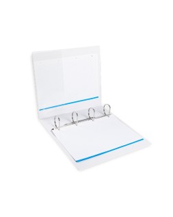 Carpeta fabricada en cartón forrado en plástico soldado de color blanco. 5 mm de grosor. Con funda transparente soldada en su interior. Carpeta con funda en la portada, contraportada y lomo que permite su personalización e identificación. Anillas mixtas. Con compresor metálico. Formato DIN A4. Medidas: 283 x 320 mm.