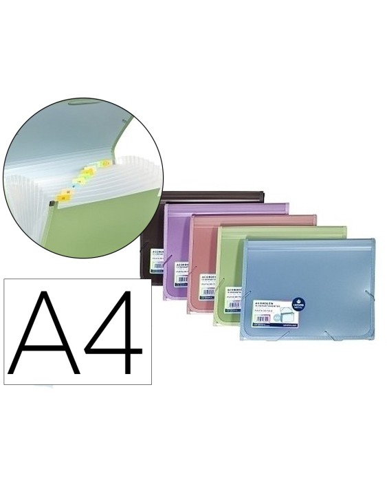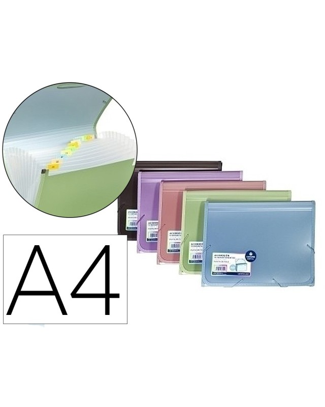 Acordeón de polipropileno metalizado reforzado con ribete de tela en todo su contorno color a juego. Colores brillantes metalizados. Con 13 departamentos interiores de polipropileno transparente con fuelle tipo acordeón. Incluye etiquetas para identificar el contenido de cada departamento. Goma redonda de cierre del mismo color. Apropiado para todo tipo de documentos tamaño Folio. Posibilidad de compra en expositor de sobremesa 12 acordeones en colores surtidos.