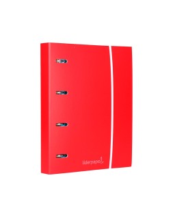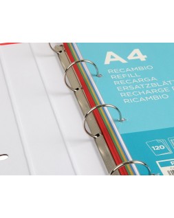 Tapa de cartón forrada de 1,75 mm de espesor. 4 anillas redondas de 40 mm. Cierre de gomilla. Con ranuras para anillas. Lomo de 20 mm. 120 hojas con 5 bandas de colores. Papel interior de 80 g/m². Cuadrícula de 5 mm. Formato DIN A4. Guarda interior impresa. Colores surtidos.