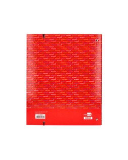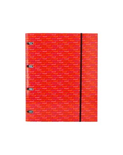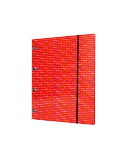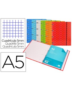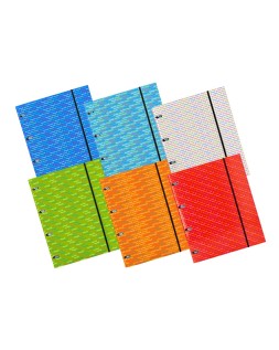 Tapa de cartón forrada de 1,75 mm de espesor. 4 anillas redondas de 20 mm. Cierre de gomilla. Con ranuras para anillas. Lomo de 20 mm. 120 hojas con 5 bandas de colores. Papel interior de 80 g/m². Cuadrícula 5 mm. Guarda interior impresa. Colores surtidos: azul, blanco, celeste, naranja, rojo y verde.
