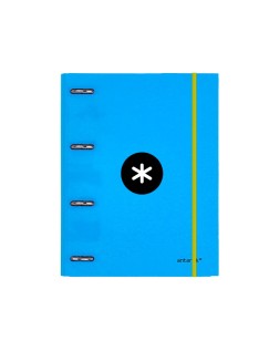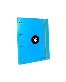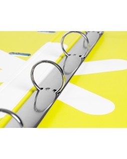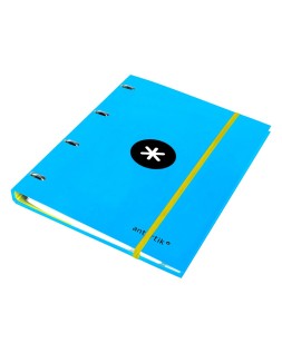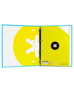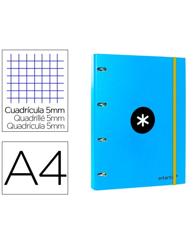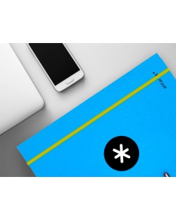 Tapa de cartón forrado de 1,75 mm de espesor. Forrada en papel estucado mate de 135 g/m² impreso. Plastificada mate con detalles barniz UVI. 4 anillas redondas. Cierre de gomilla. Con ranuras para anillas. 100 hojas con 5 bandas de color y 4 taladros. Papel interior extrablanco de 100 g/m². Ultrasuave. Cuadrícula de 5 mm. Formato DIN A4. Guarda interior impresa.