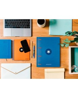 Tapa de cartón forrado de 1,75 mm de espesor. Forrada en papel estucado mate de 135 g/m² impreso. Plastificada mate con detalles barniz UVI. 4 anillas redondas. Cierre de gomilla. Con ranuras para anillas. 100 hojas con 5 bandas de color y 4 taladros. Papel interior extrablanco de 100 g/m². Ultrasuave. Cuadrícula de 5 mm. Formato DIN A4. Guarda interior impresa.