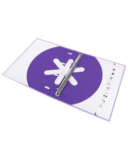 Tapa de cartón forrado de 1,75 mm de espesor. Forrada en papel estucado mate de 135 g/m² impreso. Plastificada mate con detalles barniz UVI. 4 anillas redondas. Cierre de gomilla. Con ranuras para anillas. 100 hojas con 5 bandas de color y 4 taladros. Papel interior extrablanco de 100 g/m². Ultrasuave. Cuadrícula de 5 mm. Formato DIN A4. Guarda interior impresa.