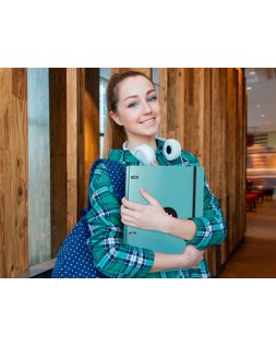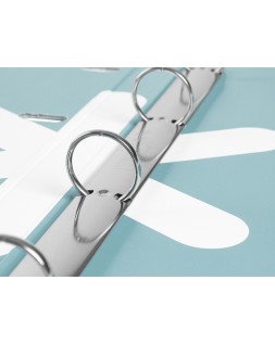 Tapa de cartón forrado de 1,75 mm de espesor. Forrada en papel estucado mate de 135 g/m² impreso. Plastificada mate con detalles barniz UVI. 4 anillas redondas. Cierre de gomilla. Con ranuras para anillas. 100 hojas con 5 bandas de color y 4 taladros. Papel interior extrablanco de 100 g/m². Ultrasuave. Cuadrícula de 5 mm. Formato DIN A4. Guarda interior impresa.