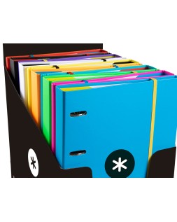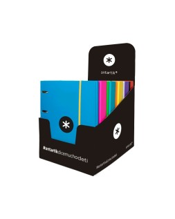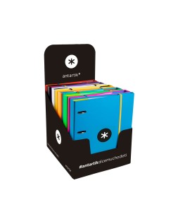 Tapa de cartón forrado de 1,75 mm de espesor. Forrada en papel estucado mate de 135 g/m² impreso. Plastificada mate con detalles barniz UVI. 4 anillas redondas. Cierre de gomilla. Con ranuras para anillas. 100 hojas con 5 bandas de color y 4 taladros. Papel interior extrablanco de 100 g/m². Ultrasuave. Cuadrícula de 5 mm. Formato DIN A4. Guarda interior impresa.