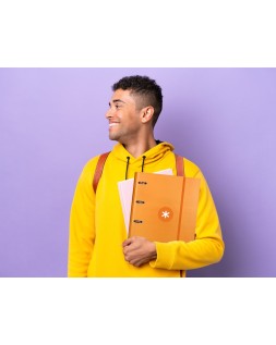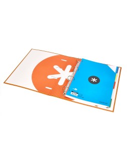 TAPA DE CARTÓN FORRADO DE 1,75 MM DE ESPESOR. FORRADA EN PAPEL ESTUCADO MATE DE 135 G/M² IMPRESO. PLASTIFICADA MATE CON DETALLES BARNIZ UVI. 4 ANILLAS REDONDAS. CIERRE DE GOMILLA. CON RANURAS PARA ANILLAS. 100 HOJAS CON 5 BANDAS DE COLOR Y 4 TALADROS. PAPEL INTERIOR EXTRABLANCO DE 90 G/M². ULTR ASUAVE. CUADRÍCULA DE 5 MM. FORMATO DIN A4. GUARDA INTERIOR IMPRESA. LOMO REDONDO, CON SEPARADOR INTERIOR Y SOLAPA.