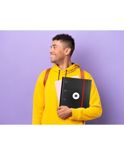 TAPA DE CARTÓN FORRADO DE 1,75 MM DE ESPESOR. FORRADA EN PAPEL ESTUCADO MATE DE 135 G/M² IMPRESO. PLASTIFICADA MATE CON DETALLES BARNIZ UVI. 4 ANILLAS REDONDAS. CIERRE DE GOMILLA. CON RANURAS PARA ANILLAS. 100 HOJAS CON 5 BANDAS DE COLOR Y 4 TALADROS. PAPEL INTERIOR EXTRABLANCO DE 90 G/M². ULTR ASUAVE. CUADRÍCULA DE 5 MM. FORMATO DIN A4. GUARDA INTERIOR IMPRESA. LOMO REDONDO, CON SEPARADOR INTERIOR Y SOLAPA.