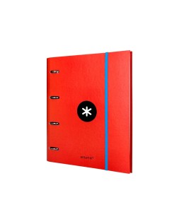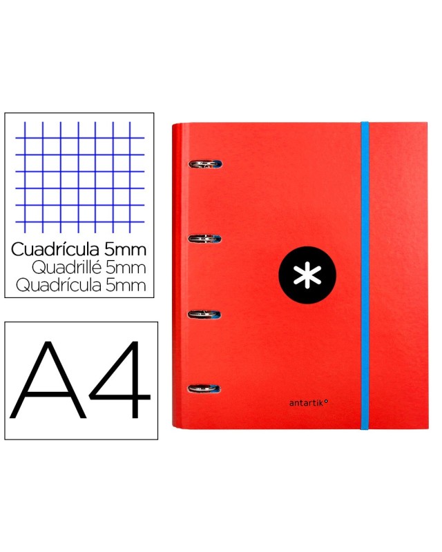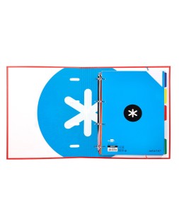 TAPA DE CARTÓN FORRADO DE 1,75 MM DE ESPESOR. FORRADA EN PAPEL ESTUCADO MATE DE 135 G/M² IMPRESO. PLASTIFICADA MATE CON DETALLES BARNIZ UVI. 4 ANILLAS REDONDAS. CIERRE DE GOMILLA. CON RANURAS PARA ANILLAS. 100 HOJAS CON 5 BANDAS DE COLOR Y 4 TALADROS. PAPEL INTERIOR EXTRABLANCO DE 90 G/M². ULTR ASUAVE. CUADRÍCULA DE 5 MM. FORMATO DIN A4. GUARDA INTERIOR IMPRESA. LOMO REDONDO, CON SEPARADOR INTERIOR Y SOLAPA.