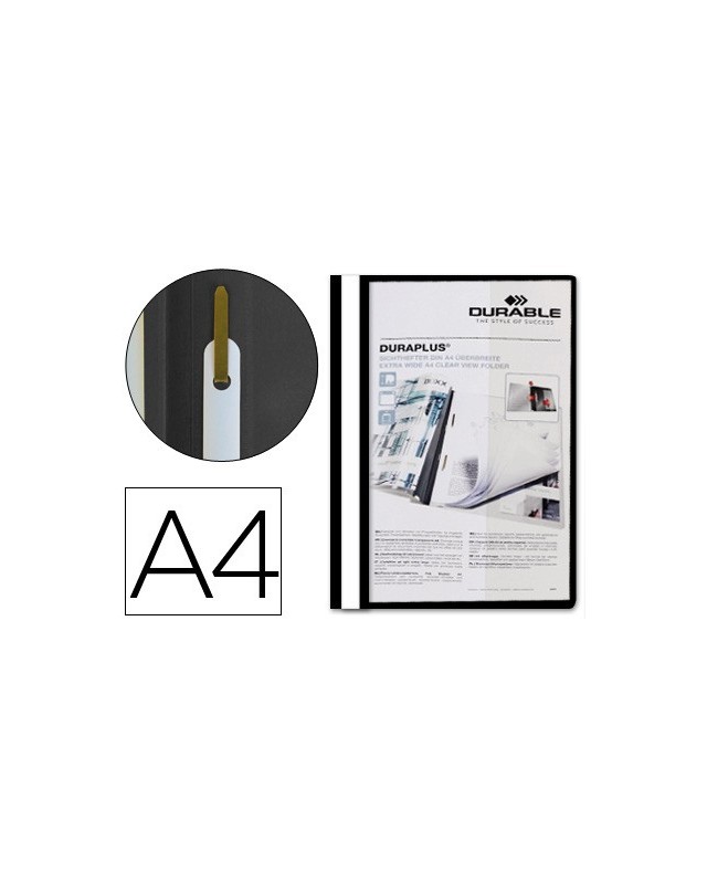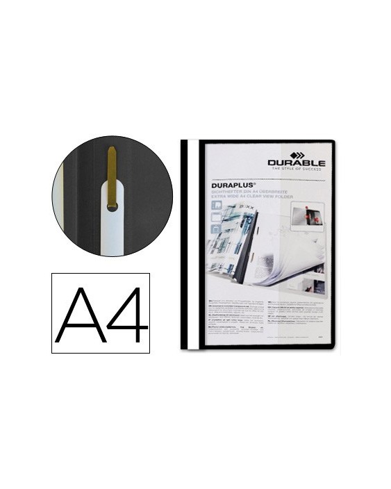 Dossier Duraplus® Durable. Fabricada en plástico, con fástener metálico con cierre de plástico, cubierta transparente y trasera opaca. Ventana con tira de papel en el lomo para personalizar el trabajo. Formato DIN A4. Tapa de 120 micras. Contratapa de 180 micras.