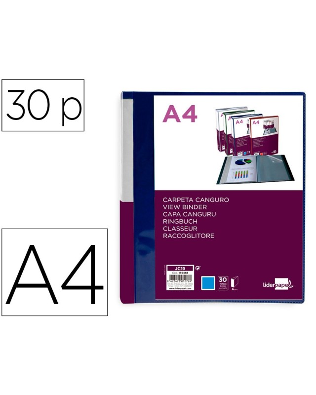 Carpeta liderpapel 30 fundas canguro pp din a4 azul translucido portada y lomo personalizable
