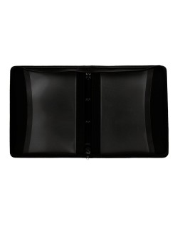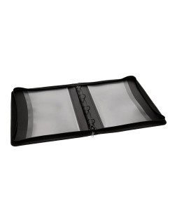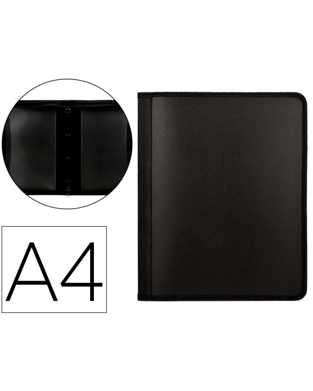 Carpeta con 4 anillas de 25 mm fabricada en polipropileno. 4 bolsillos interiores de 200 micras. Cierre con cremallera. Ribete negro en su perímetro que le da una mayor prestancia. 750 micras. Ancho de lomo: 30 mm. Formato DIN A4. Medidas: 340 x 275 mm.
