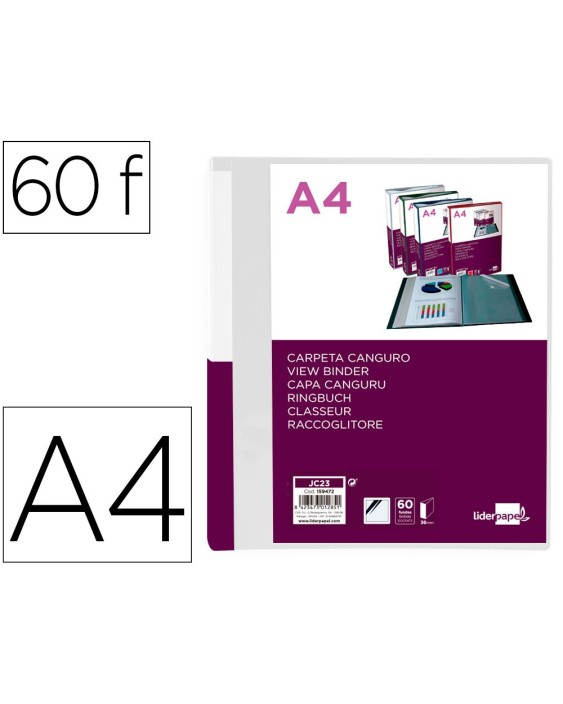 Carpeta liderpapel 60 fundas canguro pp din a4 transparenteportada y lomo personalizable