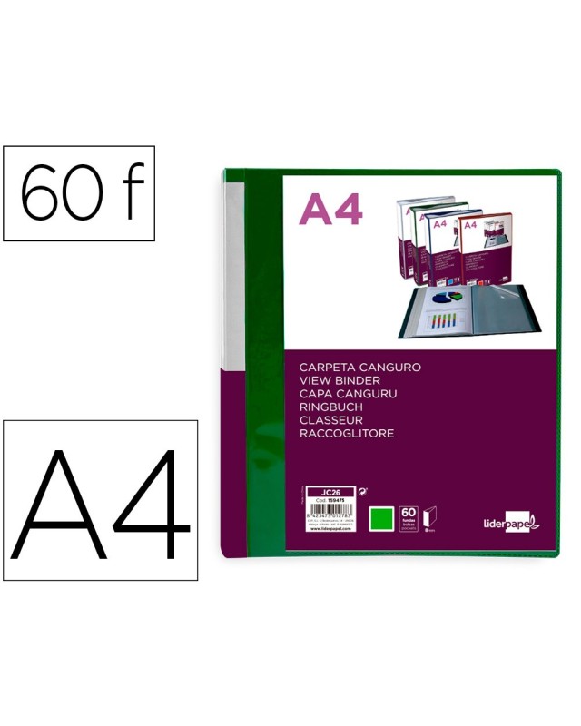 Carpeta liderpapel 60 fundas canguro pp din a4 verde translucido portada y lomo personalizable