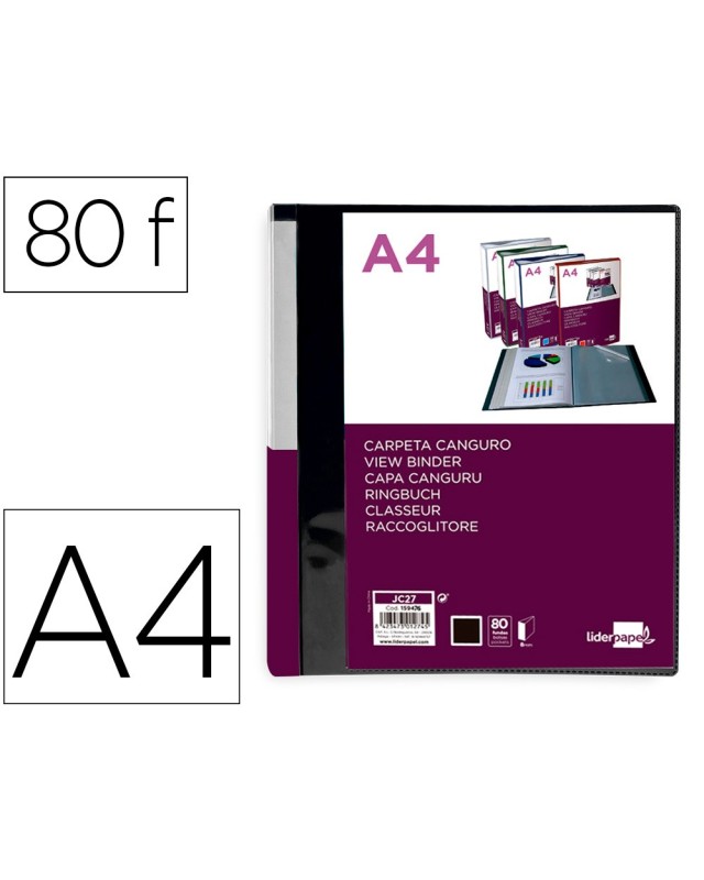 Carpeta liderpapel 80 fundas canguro pp din a4 negro opaco portada y lomo personalizable