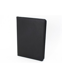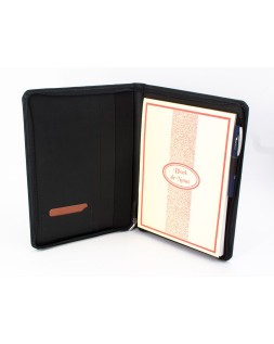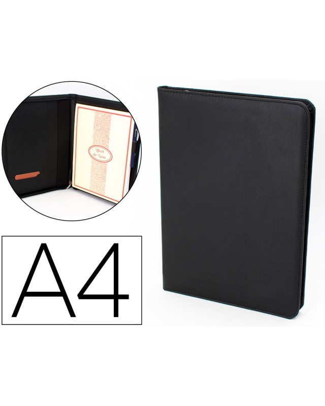 Compacto y ligero portafolio confeccionado en piel sintética con cierre de cremallera. Incluye bloc de notas. Soporte para tarjetas, bolígrafos, pendrive, PDA y CD s. Fabricado en Ubrique, España. Formato DIN A4. Color negro. Medidas: 262 x 332 x 30 mm.