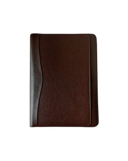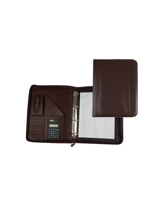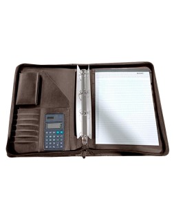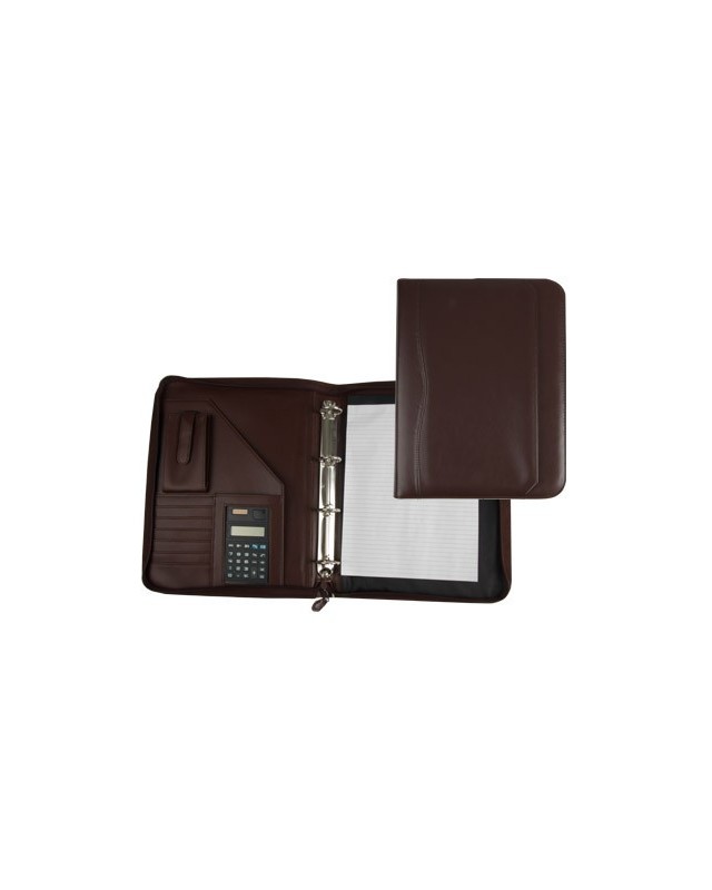Carpeta portafolios q-connect cremallera 4 anillas 20 mm concalculadora con bolsa para movil color marron 260x355 mm