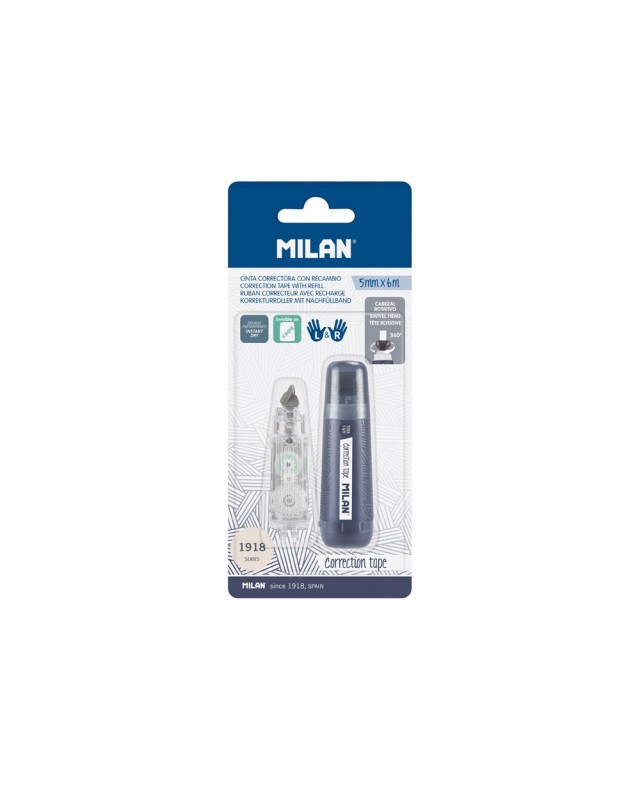 Cinta correctora en seco cilíndrica. Apta para zurdos gracias a la rotación de 360º de su punta. Rápida, limpia y precisa. Correcciones sobre todo tipo de papel, no deja marcas en fotocopias o fax. 5 mm de ancho x 6 m de largo. Incluye una cinta de recambio. Colección 430 since 1918, inspirada en los colores y diseño originales de las gomas de borrar MILAN, fabricadasen España desde 1918. Color azul marino.