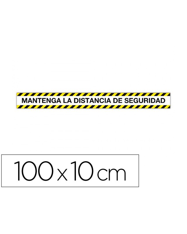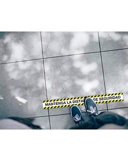 TIRA DE SEÑALIZACIÓN ADHESIVA CON MENSAJE \"MANTENGA LA DISTANCIA DE SEGURIDAD\". TIRAS DE 100 X 10 CM CON IMPRESIÓN, ACABADO MATE Y ADHESIVO SOLVENTE DE ALTA RESISTENCIA QUE NO DEJA RESIDUOS. EL FILM DE PVC PERMITE DAR GRAN CONSISTENCIA A LA CINTA, APORTA MUCHA RIGIDEZ Y LA HACE MUY RESISTENTE, OFRECE 100 MICRAS PARA GARANTIZAR UN PRODUCTO DE ALTA DURABILIDAD Y UNA CAPA DE BARNIZ MATE PROTECTORA DE 80 MICRAS. EL ADHESIVO SOLVENTE ES SIN DUDA EL ADHESIVO DE MAYOR CALIDAD, UN ADHESIVO QUE PROVIENE DEL CAUCHO NATURAL, LA RESINA DE LOS ÁRBOLES. OFRECE UN GRAN PODER DE ADHESIÓN EN CUALQUIER TIPO DE SUELOS O SUPERFICIES. IDEAL PARA LA SEÑALIZACIÓN DE COMERCIOS Y PUNTOS DE ATENCIÓN AL CLIENTE. SOPORTA TEMPERATURAS DE 0ªC