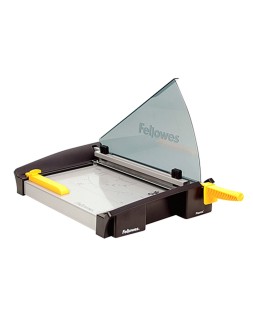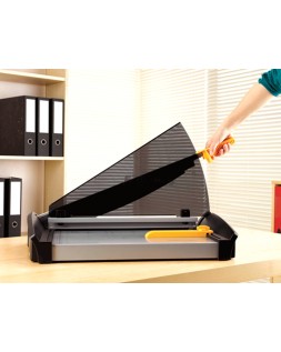 Cizalla metálica de palanca con base metálica y cuchilla de acero inoxidable con autoafilado. Protector SafeCut de cuchilla transparente para garantizar la seguridad del usuario al cortar y plegable para almacenar la máquina con facilidad. Capacidad de corte 40 hojas de 80 g/m². Prensador automático que sujeta el papel durante el corte. Para cortar papel, cartón, cartulinas, cartón pluma y otros materiales. Guías grabadas en la base en cm, pulgadas y formatos más comunes.