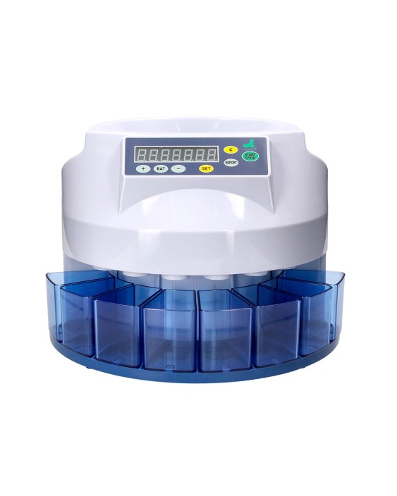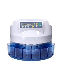 Dos modalidades de conteo. Libre: cuenta todas las monedas que están en la bandeja de entrada sin parar, hasta que una de las bandejas de salida esté llena. Con este modo la máquina predetermina por sí sola el número de lote. Conteo por lote: cuenta el lote de monedas del mismo valor que se ha predeterminado previamente. El resultado que da el contador es la cantidad de monedas y el valor que suponen. Velocidad de conteo: 216 uds./minuto. Capacidad de la bandeja de entrada: 300 - 500 uds. Capacidad de la bandeja de salida: 80-150 uds. Lote en pantalla: 3 dígitos LED. Número de conteo en pantalla: 4 dígitos LED. Medidas: 355 x 266 x 330 mm. Peso neto: 4,5 kg.