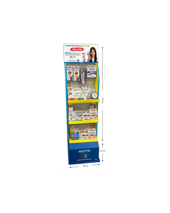 Expositor de cartón de mesa Giotto contra el Bullying. En esta Campaña 2024 Giotto destina 0,10 euros del estuche de 12 lápices de colores Giotto Colors 3.0 (cód. F276600) con packaging promocional o estándar, a favor del Plan de Sensibilización y Prevención contra el Bullying, dirigido a todos los alumnos de las escuelas de España, que ha creado junto a la Asociación Española para la Prevención del Acoso Escolar (A.E.P.A.E.). Descubre todo el Proyecto en www.todospintamoscontraelbullying.com .