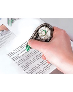 Cinta correctora con diseño ergonómico y tecnología de aplicación lateral para una corrección especialmente cómoda y precisa. Cinta PET resistente al desgarro, aplicable hasta el último milímetro. Sin tiempo de secado, permite escribir encima inmediatamente y con gran pulcritud tras su aplicación. Carcasa hecha con plástico 100% reciclado. Ancho de la cinta: 4,2 mm. Largo: 10 m.
