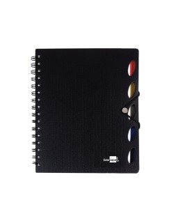 Tapa de polipropileno de 1650 micras de espesor extrarresistente metalizada. 100 hojas. Papel de 80 g/m². Cuadrícula de 5 mm. Microperforado. Doble espiral nylonizada color negro. 5 separadores intercambiables. 5 índices de color. Cierre de gomilla con elástico y sujeción metálica.