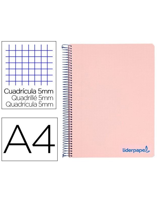 Cuaderno espiral liderpapel a4 micro wonder tapa plastico 120h 90 gr cuadro 5mm 5 bandas 4 taladros color rosa