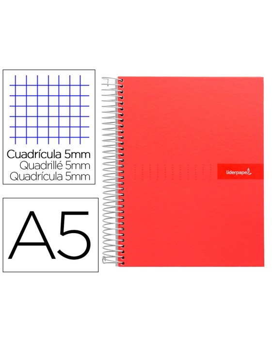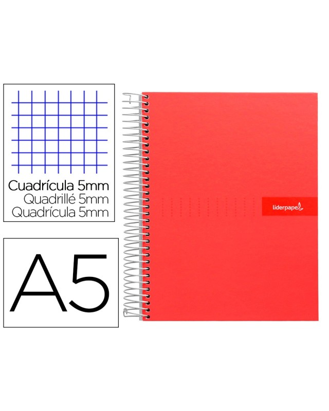Cuaderno espiral liderpapel a5 micro crafty tapa forrada 120h 90 gr cuadro 5mm 5 bandas6 taladros color rojo
