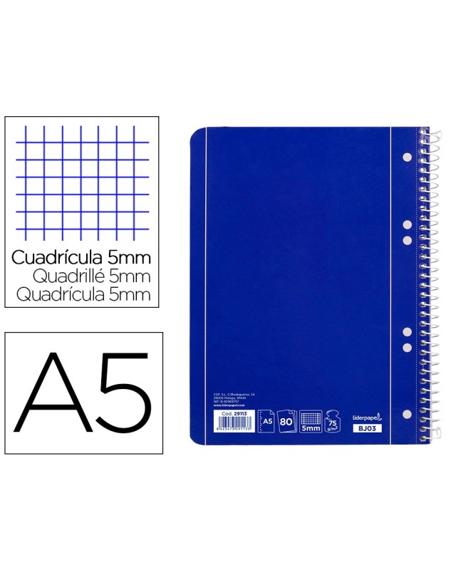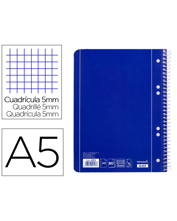 Cuaderno espiral liderpapel a5 micro serie azul tapa blanda 80h 75 gr cuadro5mm 6 taladros azul